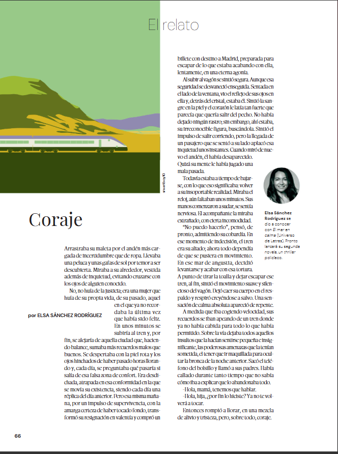 Ya está online el relato de la autora titulado "Coraje", que ha sido publicado por la revista Club de Renfe. Esta obra promete ofrecer una lectura emocionante y conmovedora, explorando temas de valentía y superación. No te pierdas la oportunidad de disfrutar de este magnífico relato que ya está disponible para todos los amantes de la literatura. ¡Sumérgete en la historia de "Coraje" y déjate llevar por su narrativa!a.